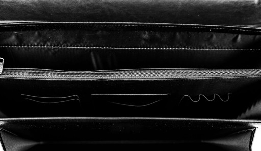 Wewnątrz teczki znajdują się 2 duże komory, a pomiędzy nimi duża kieszeń na zamek, miejsce na komórkę, wizytówki oraz długopisy.