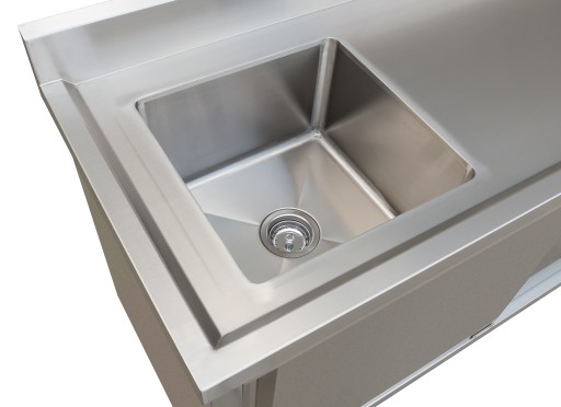 Stół roboczy, zlew (basen), szafka z rantem ochronnym na ścianę, ze stali nierdzewnej kwasoodpornej INOX, zamykana drzwiami przesuwnymi, stół roboczy ze zlewem (basenem)