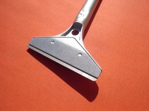 - Skrobak wykonany jest z metalowej rurki, która pokryta jest antykoryzyjną powłoką; posiada wygodną gumową rękojeść oraz zakuty mechanicznie aluminiowy uchwyt do wymiennego ostrza,