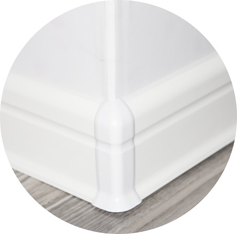 - Smukła i zaokrąglona budowa na górze listwy PCV (brak tzw. półki) minimalizuje gromadzenie się kurzu i brudu na jej powierzchni; osiadający kurz i brud prawie w 100% opada z listwy na podłogę przez co szybciej i łatwiej jest utrzymać podłogi i listwy w czystości