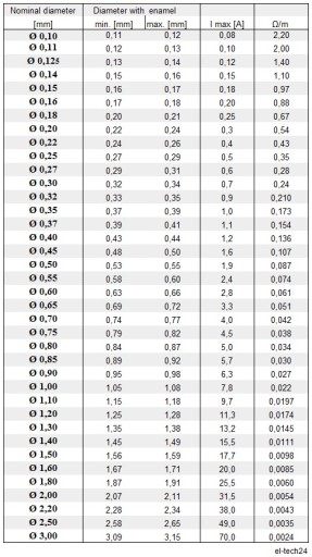 Jest to średnica żyły miedzianej. Średnica wraz z warstwą emalii podana w tabeli.