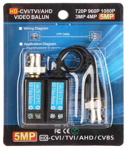 TR-1CD*P2 przeznaczony jest do przesyłu sygnału wideo za pomocą skrętki komputerowej. Urządzenie dopasowuje impedancję kabla koncentrycznego 75Ω do impedancji przewodu symetrycznego zapewniając przesył sygnału wizyjnego do 400m (skrętka komputerowa 5 kategorii) oraz eliminuje zakłócenia niesymetryczne.