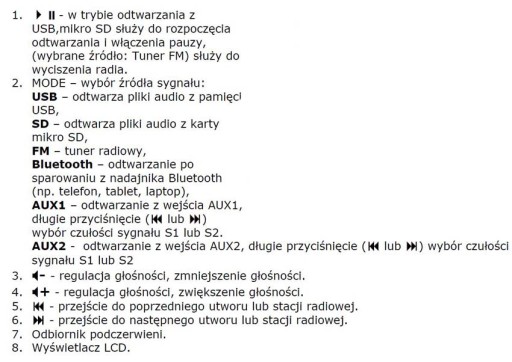 - Gniazdo USB oraz kart pamięci z obsługą do 32gb(format plików: mp3, wma. wav, aac, flack)