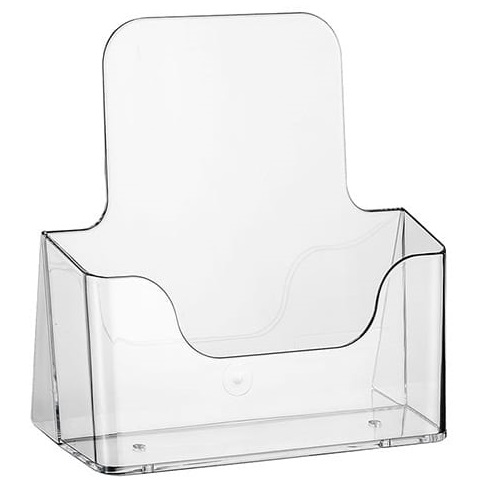 Stojak jest wykonany z trwałego i solidnego materiału, który zapewnia stabilność i długotrwałe użytkowanie. Jego kompaktowa konstrukcja zajmuje niewiele miejsca, dzięki czemu możesz go łatwo umieścić na biurku, ladzie, regale lub innych miejscach, gdzie chcesz prezentować ulotki.