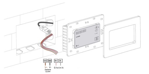 W celu zamontowania urządzenia należy wywiercić jeden otwów o średnicy 150 mm dla głośnika, który zostanie zamontowany: L lub R. Kabel głośnikowy łączymy z panelem ściennym poprzez wcześniej przygotowany otwór montażowy o wymiarach 125x75x35mm. Sterownik ścienny podłączymy następnie do źródła zasilania (dołączony zasilacza 24V) oraz opcjonalnie kabel Ethernet RJ-45, jeśli router W-fi znajduje się w znacznej odległości od systemu audio i jest obawa o poprawny odbiór sygnału.