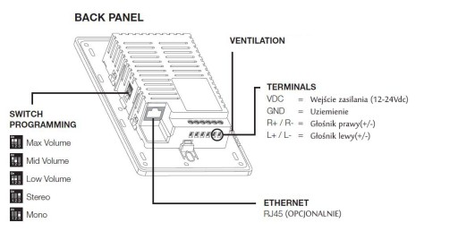 Urządzenie daje również możliwość odtwarzania dźwięku poprzez wejścia AUX, które znajduje się na froncie panela ściennego.