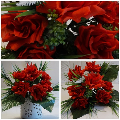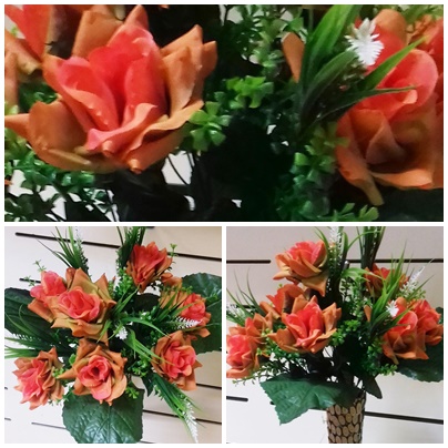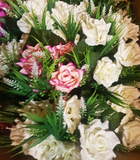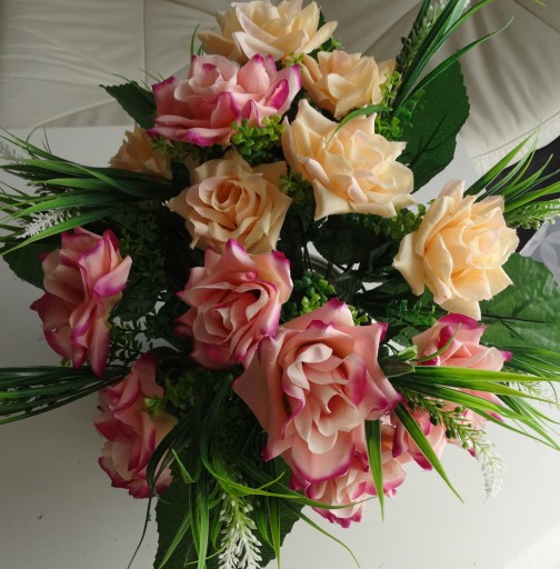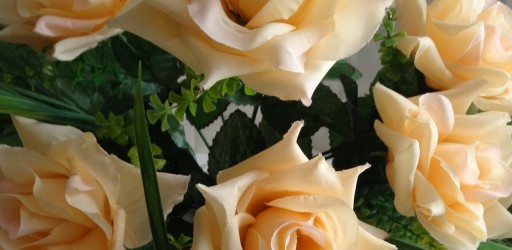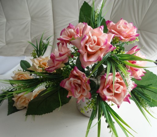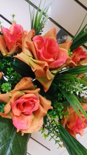 Sztuczne kwiaty, rozwinięte płatki kwiatów- róże w pięknych ,nasyconych kolorach.
