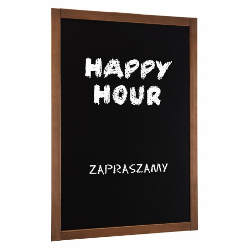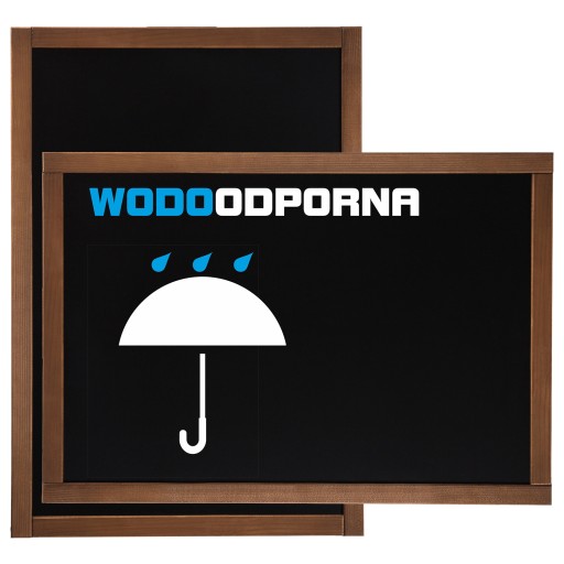 Wodoodporna, bardzo duża tablica kredowa w drewnianej ramie. Można po niej pisać kredą lub markerem kredowym. Drewniana rama tablicy jest olejowana, co zabezpiecza ją przed szkodliwym działaniem czynników atmosferycznych, takich jak opady deszczu i śniegu. Powierzchnia do pisania wykonana jest z wodoodpornej płyty ABS z tworzywa sztucznego, o bardzo dużej wytrzymałości. Zabezpieczenie przed wilgocią gwarantuje długoletnie i komfortowe eksploatowanie tablicy. Ze względu na swoje bardzo duże rozmiary (60 x 87 cm!) może być zamieszczona w dużej odległości od odbiorcy. Można ją wieszać zarówno w poziomie jak i pionie. Doskonale prezentuje się na sztaludze.