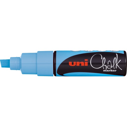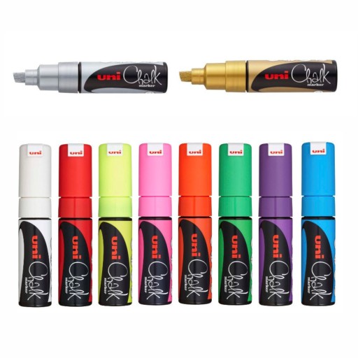 Markery kredowe UNI CHALK przeznaczone są do potykaczy oraz tablic wodoodpornych, szkła, plastiku i innych gładkich powierzchni. Dostępne są w 10 fluorescencyjnych kolorach do wyboru. Posiadają podwyższoną odporność na działanie deszczu i śniegu. Ścięta skośnie końcówka daje możliwość zmiennego, fantazyjnego prowadzenia linii pisania do 8 mm szerokości. Miękka końcówka markerów nie niszczy powierzchni do pisania, dlatego Twój potykacz czy tablica kredowa będą Ci służyć znacznie dłużej niż przy użyciu zwykłej kredy.