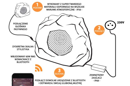- Głośnik zewnętrzny z bluetooth w kształcie skały 60W 8 Ohm IP56