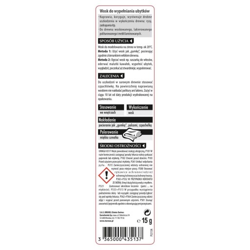 Starwax Wosk do zapełniania ubytków - woski w sztabkach do naprawy, korekty i zalepiania małych ubytków w wykończeniu drewna: rys, zadrapań, otworów po szkodnikach. Może być stosowany do powierzchni woskowanych i lakierowanych. Występuje w kilku odcieniach: jasny dąb, średni dąb, dąb rustykalny, orzech, wiśnia.
