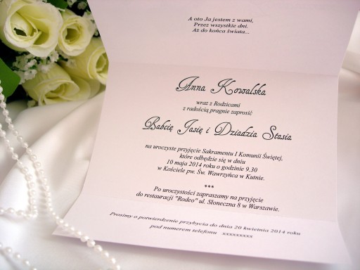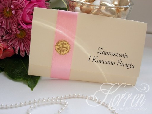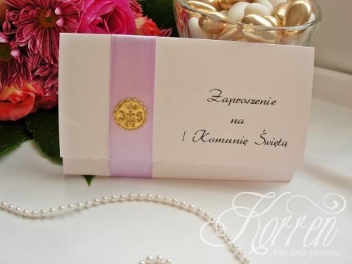 Przepiękne zaproszenie wykonane z papieru wysokiej jakości (246-250 g/m2) ozdobione hostią i atłasową wstążką.