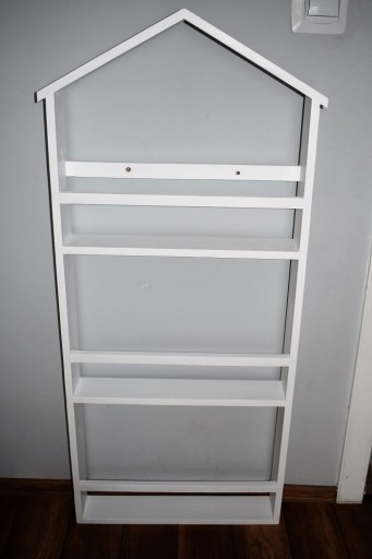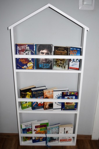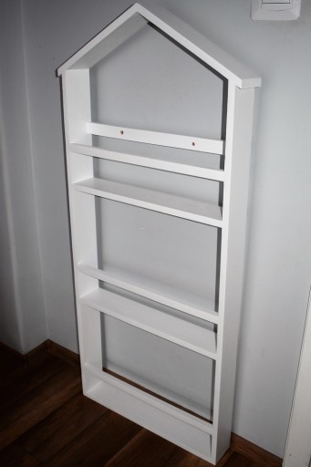 Na sprzedaż mam polke na książki w kształcie domku z litego drewna sosnowego wykonana ręcznie i pomalowana bialą farbą ekologiczną. Półka swietnie nadaje się na duże książki ponieważ przerwa między półkami to 40 cm, półka nie posiada płyty tylnej ,możliwość dorobienia koszt 50 zl