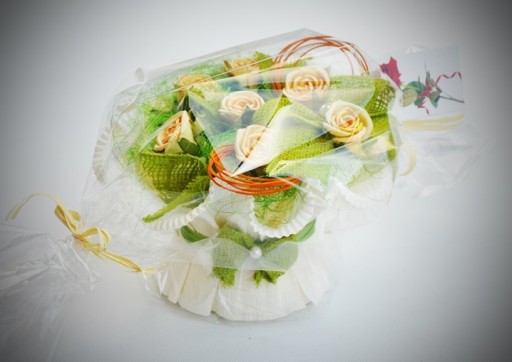 Piękny, jak z żywych kwiatów, ale będzie cieszył oko o wiele dłużej. Oryginalny i niepowtarzalny bukiet z ręczników i uroczej dekoracji florystycznej.
