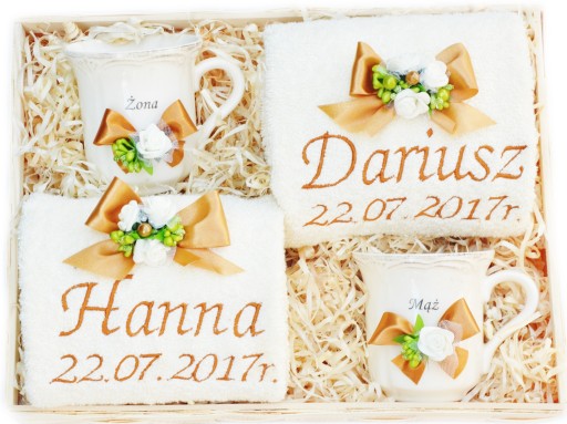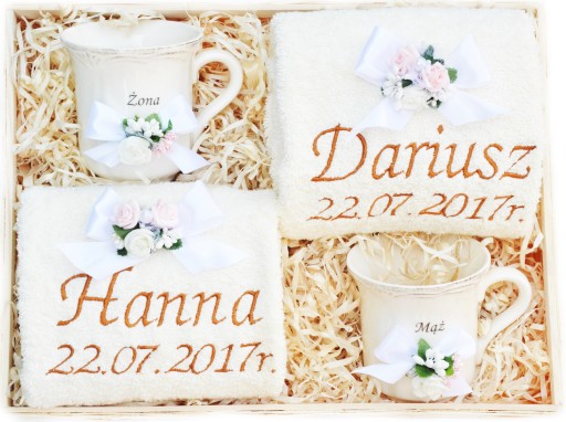 - ręcznik łazienkowy 50x100cm w wybranym kolorze z haftem:"imię męża i data ślubu" lub imię i ozdobna aplikacja graficzna,