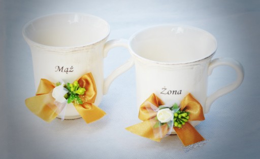 - komplet kubków porcelanowych z Manufaktury Chodzieskiej o pojemności 400 ml z ręcznie wykonanym napisem: "Żona", "Mąż" (do wyboru filiżankami o tej samej treści) lub "Najlepsza Żona", "Najlepszy Mąż",