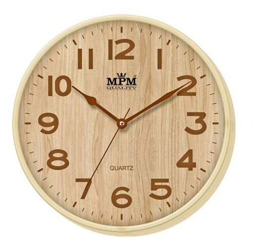 Zegar posiada okrągłą, imitującą drewno obudowę wykonaną z plastiku, oraz przejrzystą i doskonale czytelną tarczę w stylu klasycznym, z arabskimi cyframi. Całość sprawia, że zegar jest bardzo efektowny.