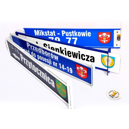 Proszę wpisać w wiadomości do sprzedającego informację o tym, co ma widnieć na tabliczce adresowej (kolor tła, kolor napisów oraz dokładny tekst + ewentualnie: logo, herb, strzałki itp.)