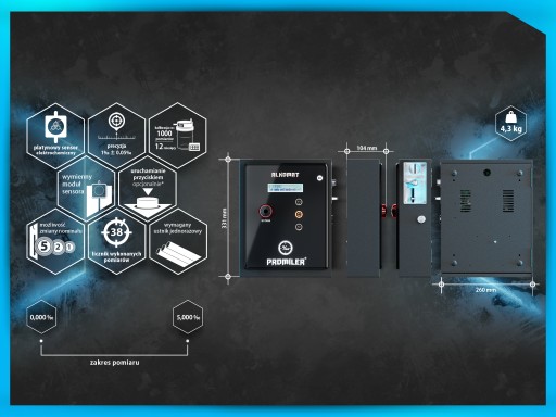 PROMILER AL 4000 to najczęściej spotykany na komendach policji alkomat stacjonarny, który doskonale sprawdza się też w miejscach publicznych i w firmach. Pomiar dokonywany jest przez rozbudowany układ pomiarowy, a jego wynik pojawia się na czytelnym wyświetlaczu LCD. To urządzenie niezwykle dokładne i wytrzymałe,dlatego cieszy się dużą popularnością.