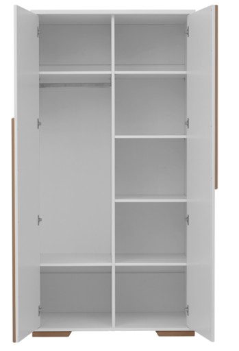 Wewnątrz przegroda pionowa oraz różne możliwości aranżacji wnętrza szafy - np. 4 półki z jednej strony oraz 2 półki i drążek na ubrania z drugiej strony - w standardzie 6 półek i 1 drążek na ubrania - możliwość dokupienia dodatkowych półek (maksymalnie 2 sztuki).