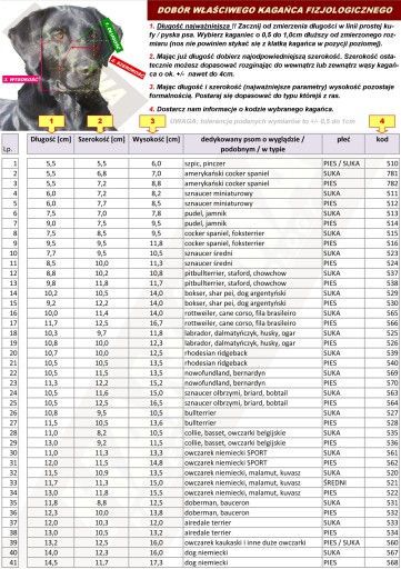 - Wykorzystując załączoną do oferty TABELĘ Z ASORTYMENTEM (opisaną w nagłówku: Dobór właściwego kagańca fizjologicznego), która zawiera wymiary każdego kagańca oraz kryterium rasy, należy odszukać kaganiec najbardziej zbliżony wymiarami do rozmiarów pyska psa. Jeśli typów jest kilka należy skorzystać z opisanej sugestii po rasach aby dokonać optymalnego wyboru.Przy doborze najważniejsze są wymiary pyska psa, kryterium rasy nie powinno być pierwszoplanowym a jedynie uzupełniającym i pomocnym w doborze ostatecznym.Przykładowo młody i/lub nierozrośnięty owczarek niemiecki pies wymiarami pasuje do kagańca po rasach dedykowanego dla owczarka belgijskiego psa. Młody i/lub nierozrośnięty rottweiler pies wymiarami pasuje do kagańca po rasach dedykowanego dla boksera psa. Młody i/lub nierozrośnięty bokser pasuje do kagańca po rasach dedykowanego dla sznaucera średniego psa. Przykładów potwierdzających jak ważne jest poprawne odczytanie wymiarów pyska psa i dobór po wymiarach jest wiele, kryterium rasy jest pomocne na ostatnim etapie.