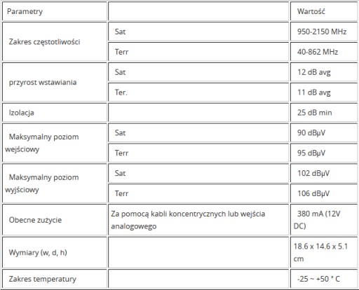 Tak dobre parametry, pozwalają montować wzmacniacz w niewielkich odległościach od anteny SAT.