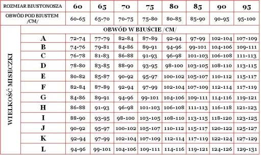 W biuście mierzymy się w biustonoszu typu soft - o miękkich, nieusztywnianych miseczkach. Panie o piersiach jędrnych, które nie opadają, mogą mierzyć obwód w biuście, stojąc prosto. Panie, których piersi opadają, powinny mierzyć obwód w biuście, pochylając się w przód. Obwód piersi mierzymy w najszerszym miejscu, mniej więcej na wysokości brodawek. Nie ściskamy biustu, pozwalamy swobodnie przesuwać się centymetrowi i odczytujemy dokładnie wynik. Następnie korzystając z tabeli rozmiarów, szukamy obu liczb i odczytujemy wynik, który wypada na ich przecięciu. Ponieważ każdy kraj ma inny system numeracji, nierzadko występują także znaczne różnice wśród naszych krajowych producentów, w opisie każdej naszej aukcji zamieszczamy tabelę producenta licytowanego przedmiotu.