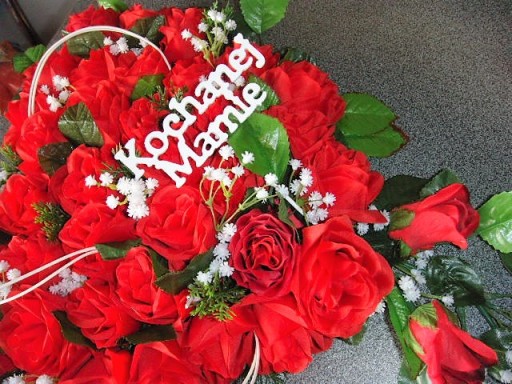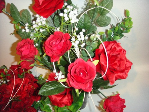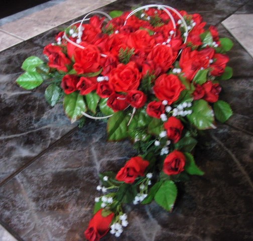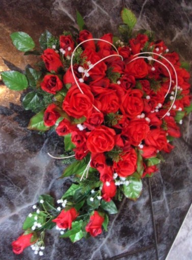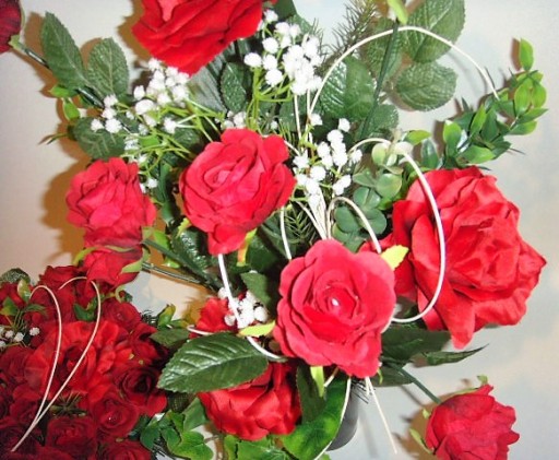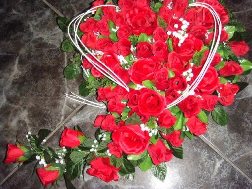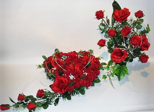 Na tej aukcji oferujemy Państwu bardzo ciekawy, nietuzinkowy komplet - stroik na grób albo do dekoracji wykonany w kształcie serca w kolorystyce jak na zdjęciach (czerwieni) + bukiet w wkładzie do wazonów (wystarczy włożyć do posiadanego wazonu).