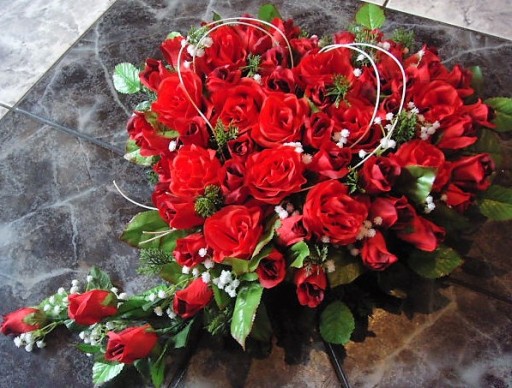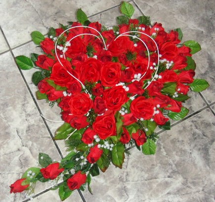Do wykonania oferowanej kompozycji użyto wysokiej jakości około 60 szt kwiatów sztucznych czerwonych róż, zielonych gałązek, gipsówki innych dodatków florystycznych. Użyte materiały są bardzo dobrej jakości, odporne na warunki atmosferyczne. Serce wykonane jest na styropianie przyklejonym do wodoodpornej sklejki. Od spodu jest zamocowana podpórka która służy również za "rączkę" do trzymania serca.