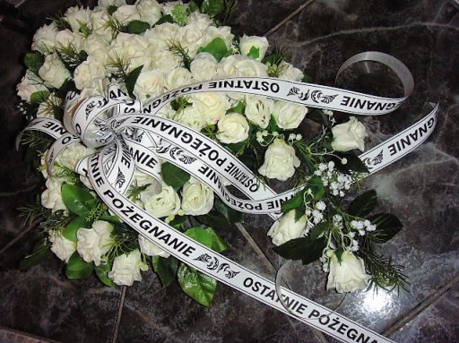 Jeżeli kompozycja jest zakupiona na pogrzeb w stroik możemy wpiąć GRATIS wstążkę z napisem OSTATNIE POŻEGNANIE, albo inną wstążkę ozdobną w wybranym kolorze
