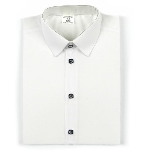 Elegancka, biała koszula chłopięca z długim rękawem, idealnie nadająca się na wszelkiego rodzaju uroczystości szkolne, kościelne i rodzinne. Skład surowca: 35% bawełny, 65% poliestru. Doskonałym uzupełnieniem stroju do koszuli będzie elegancki garniturek (spodnie z kamizelką) lub same spodnie.