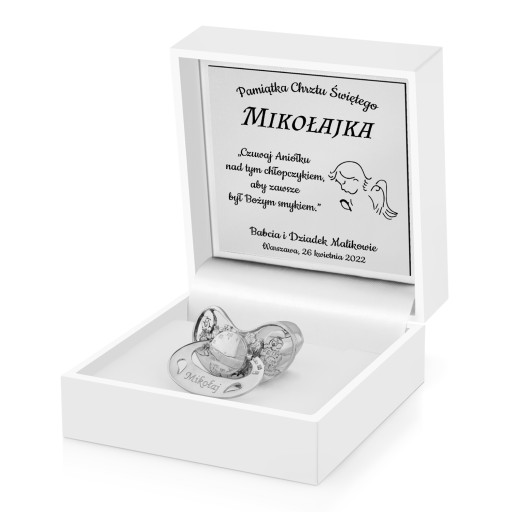 - Grawerowana tabliczka w kolorze SREBRNYM dopasowana do wieczka pudełka