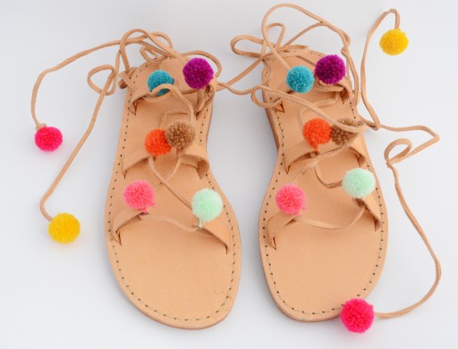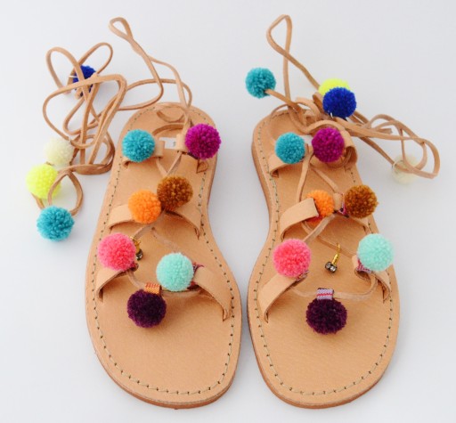 Najmodniejsze w tym sezonie, sandały rzymianki z pomponami.