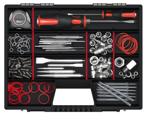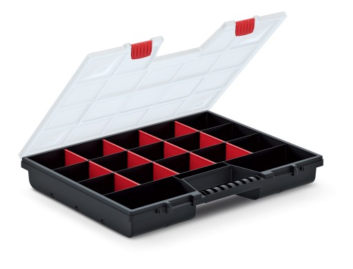 Organizer NOR20 składa się z 6 głównych komór. Trzy z nich można podzielić przegródkami na 15 komór o wymiarach 8,5x9 cm i głębokości 6 cm. Stosując wszystkie przegródki uzyskujemy 18 komór.