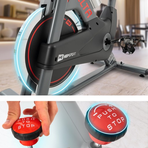 Ćwicz to utraty tchu i nie martw się o swoje bezpieczeństwo! Rower spiningowy Delta posiada specjalne zabezpieczenia, dzięki którym nie straszne Ci będą nawet intensywne treningi. Pedały zabezpieczone są systemem pasków, uniemożliwiających wyślizgnięcie się stóp. Z kolei 20 kg koło zamachowe zostało dodatkowo zabudowane, a sprzęt posiada hamulec bezpieczeństwa tuż pod kierownicą, który w momencie zatrzyma urządzenie