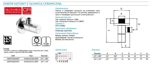 УГЛОВОЙ КЛАПАН ДЛЯ ОБЪЕКТОВ 1/2 x 3/8 ХРОМ КЕРАМИКА