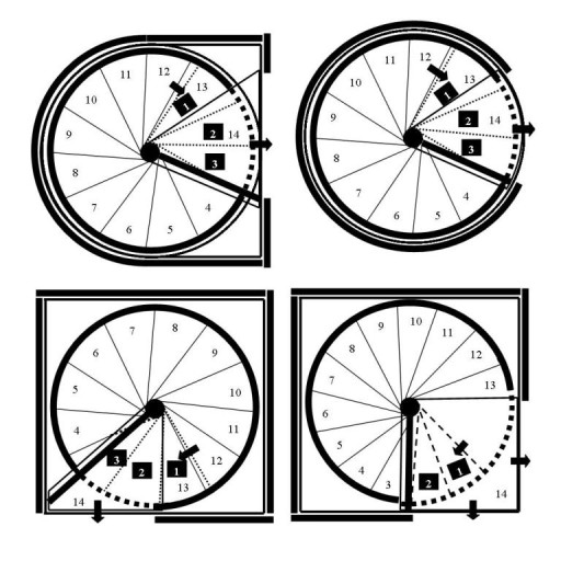 Możliwe układy schodów według podestów: lewoskrętny lub prawoskrętny.