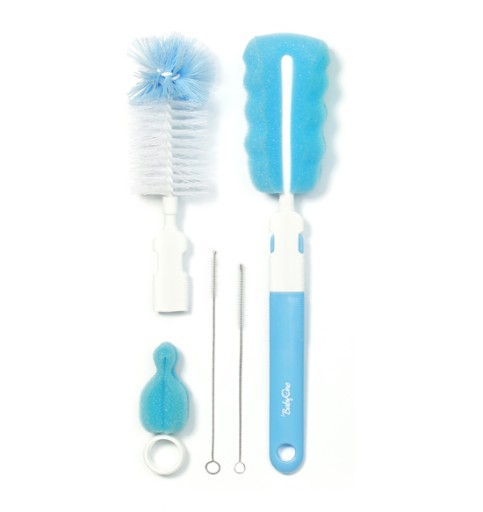 Zestaw szczotek do butelek i smoczków pomaga w ich dokładnym czyszczeniu. Zestaw jest wyposażony w dwie wymienne końcówki do mycia butelek, jedna jest zakończona szczotką z miękką włosiem druga elastyczną gąbką, końcówki można dowolnie zamieniać. Zestaw zawiera dodatkowo gąbkę do czyszczenia smoczków. Szczotka posiada otwór do zawieszenia w celu osuszenia przed kolejnym użyciem. Szczotki docierają do trudno dostępnych miejsc, a wygodne rączki zapewniają stabilny uchwyt. Szczotki wykonane są z trwałych i bezpiecznych materiałów, nie zawierających Bisfenolu A.