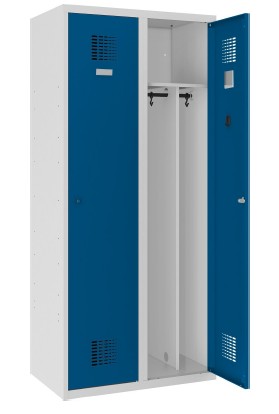 Metalowa dwudrzwiowa szafa ubraniowa. Wymiar : 1800x800x500 (wys x szer x gł). Każda komora szafy podzielona na dwa przedziały, umożliwiające oddzielne umieszczenie odzieży ochronnej i ubrań codziennych. Szafa jest zmontowana. Zgrzewanie zapewnia wysoką jakość wykonania. Wyposażona jest w plastikowy drążek, wieszaki ubraniowe, haczyk na ręcznik lusterko oraz samoprzylepny plastikowy wizytownik. Zamykana zamkiem cylindrycznym w jednym punkcie. Drzwi szafy z perforacją o nowoczesnym designie. Światło pomiędzy półką wewnętrzną a wieńcem 300 mm. Konstrukcja oparta jest na profilach zamkniętych, które zastosowano w ścianach drzwiach oraz wieńcach środkowych i dolnych. Kolor jasny popiel RAL 7035.