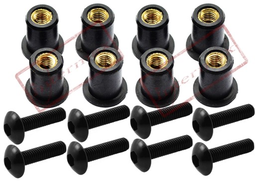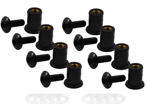 Komplet śrub aluminiowych z podkładkami dystansowymi i gumowymi tulejami. Tuleje posiadają metalowy rdzeń. Śruby służą do mocowania owiewek oraz szyb w motocyklu.