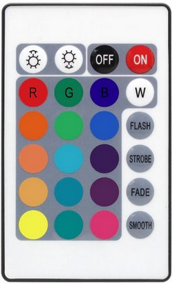 - 16 przycisków włączających na stałe kolory: czerwony, zielony, niebieski i po cztery odcienie tych kolorów, oraz biały
