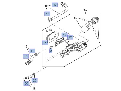 - chłodnice oleju firmy NRF w zestawie z 3 uszczelkami (nr. 9, 12, 14, 15)
