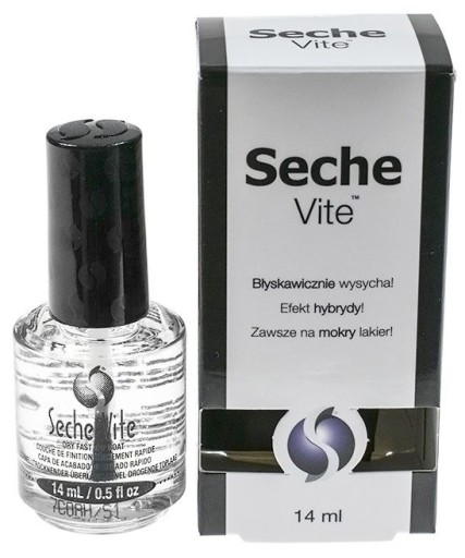 Sposób użycia: Zawsze aplikuj Seche Vite na jeszcze wilgotny lakier kolorowy. Na końcu pędzelka uformuj dość dużą kroplę Seche Vite, a następnie rozprowadź ją równomiernie na paznokciu, pamiętając o pomalowaniu końcówek. Staraj się nie dotykać pędzelkiem lakieru kolorowego, ponieważ mogą w ten sposób powstać prześwity. Seche Vite wysycha w kilka minut. Nie stosuj Seche Vite na suchy lakier kolorowy, ani w celu odświeżenia manicure.