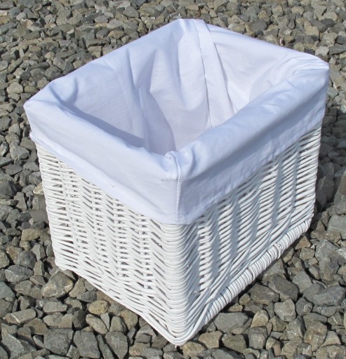 Przedmiotem aukcji jest pojemnik kosz wykonany z pełnej wikliny, malowany na biało. Koszyk obszyty materiałem.