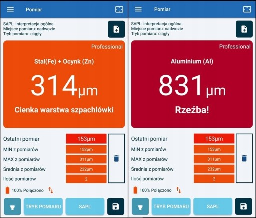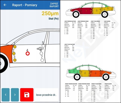 Aplikacja dodatkowo pozwala tworzyć historię pomiarów z podziałem na elementy karoserii, jak również możliwość eksportu danych w celu ich przetwarzania.