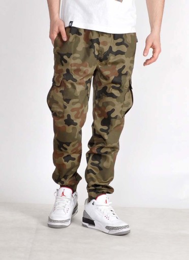 na kolanach kieszenie zapinane na guziki - prawa kieszeń przedzielona aby ustabilizować np. telefon