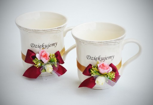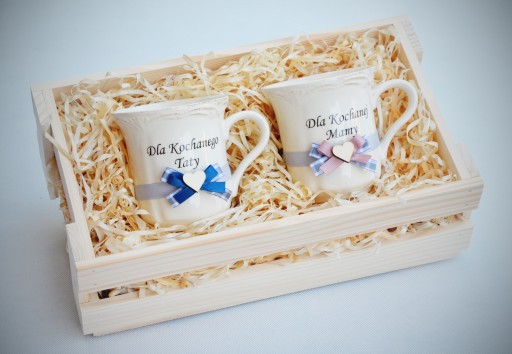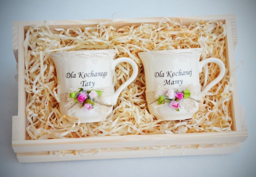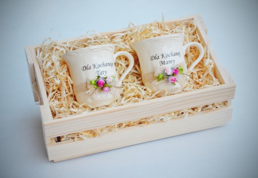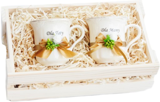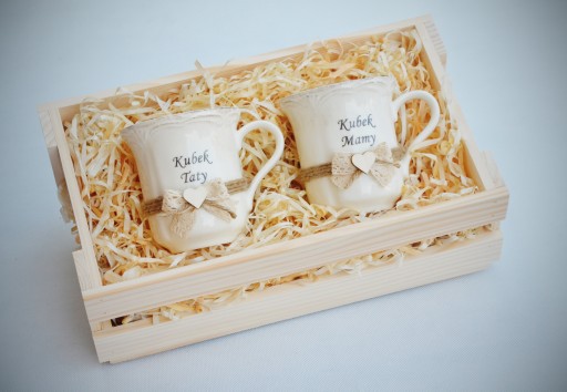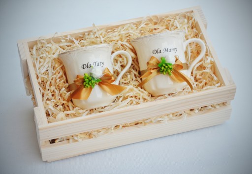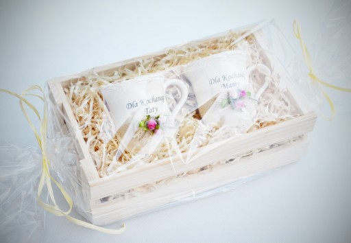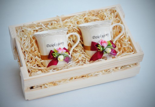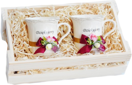 Eleganckie PODZIĘKOWANIA dla RODZICÓW na ślub - praktyczny i oryginalny komplet wysokiej jakości KUBKÓW z chodzieskiej PORCELANY - wyjątkowy i ekskluzywny zestaw w drewnianej skrzynce.