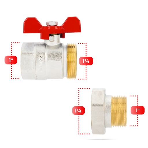 Zawór kulowy motylkowy z dławikiem 1" GW x 1 1/4" GZ i śrubunkiem 1 1/4'' GW x 1'' GZ