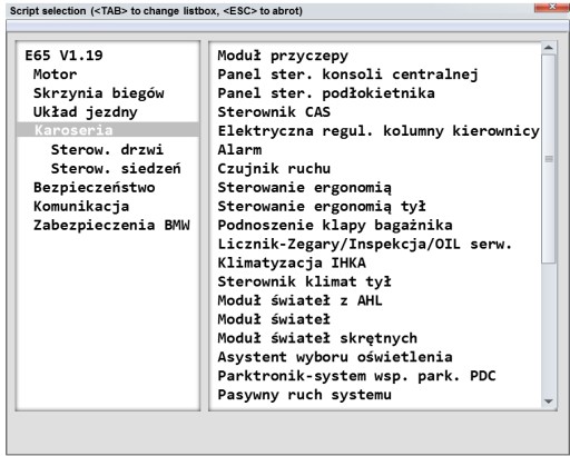 Po uruchomieniu programu wybieramy moduł z którym chcemy się połączyć (może to być sterownik silnika, abs`u, air-bag`u, immobilisera lub każdy inny spośród kilkudziesięciu dostępnych). Gdy dokonamy wyboru odpowiedniego modułu czekamy na zgłoszenie się sterownika.