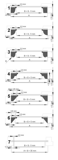 Widok z góry / przekrój i sposób pomiaru przy różnych kształtach listew przyszybowych